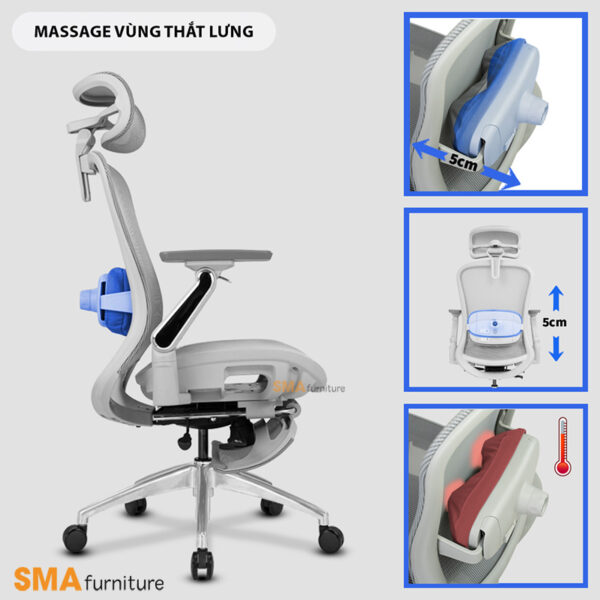 Tựa lưng Adjustable Posturefit SL Support (ALP) hỗ trợ xương sống. Kệ để tay PU tùy chỉnh 4D: cao, sâu và 2 góc (có hỗ trợ nâng cấp kệ để tay bằng da). Tùy chỉnh chiều cao, và tất cả các góc ngả ghế (kể cả ngả về phía sau và ngả về phía trước). Bánh xe sàn (được nâng cấp từ bánh xe thảm).