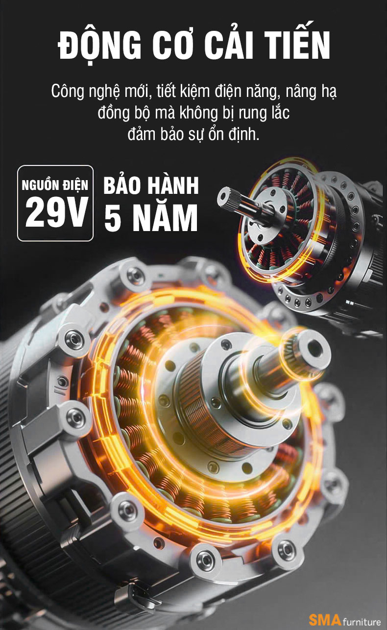 Sử dụng hai động cơ mạnh mẽ, SMA HiLeg-V đảm bảo khả năng nâng hạ ổn định, mượt mà và êm ái. Hai động cơ này giúp giảm ma sát và tăng cường độ bền cho sản phẩm, đảm bảo bạn có thể sử dụng trong thời gian dài mà không lo ngại về sự cố.