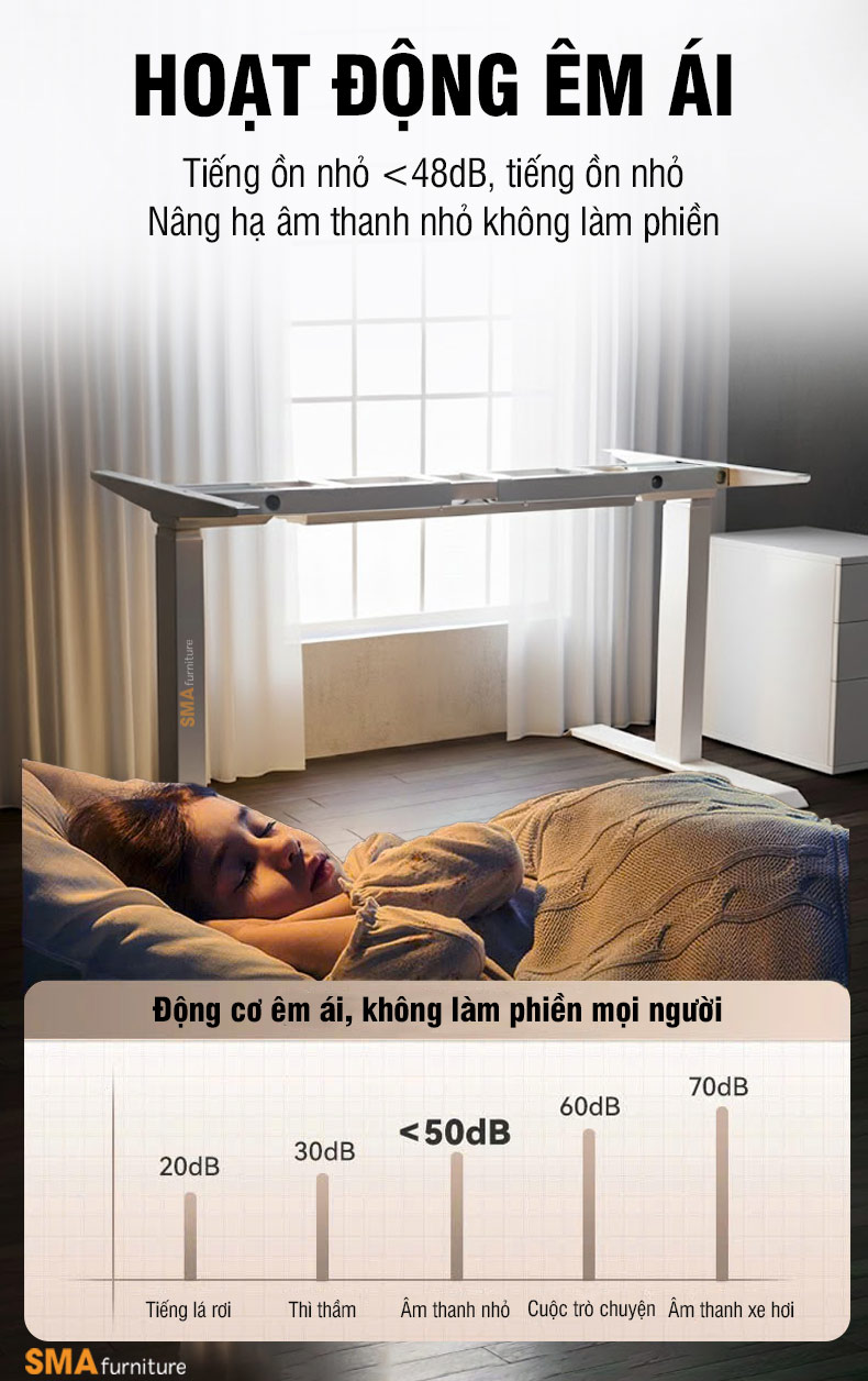 Với độ ồn thấp dưới 48dB, SMA HiLeg-V đảm bảo rằng bạn có thể thay đổi chiều cao bàn mà không gây ra tiếng ồn khó chịu, mang đến một không gian làm việc yên tĩnh và hiệu quả.