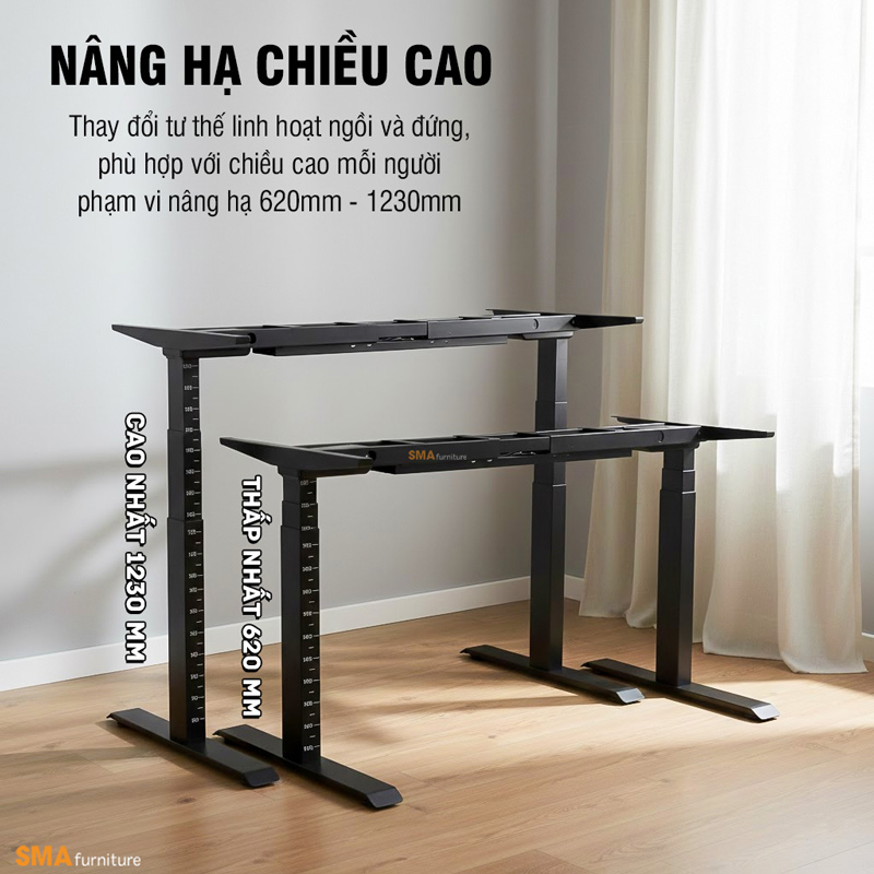 SMA HiLeg-V có khả năng điều chỉnh chiều cao bàn từ 620mm đến 1230mm, giúp bạn dễ dàng thay đổi tư thế làm việc từ ngồi sang đứng chỉ trong tích tắc. Điều này không chỉ mang lại sự thoải mái mà còn giúp giảm thiểu tình trạng đau lưng, mỏi cổ và các vấn đề về tuần hoàn khi làm việc lâu dài.