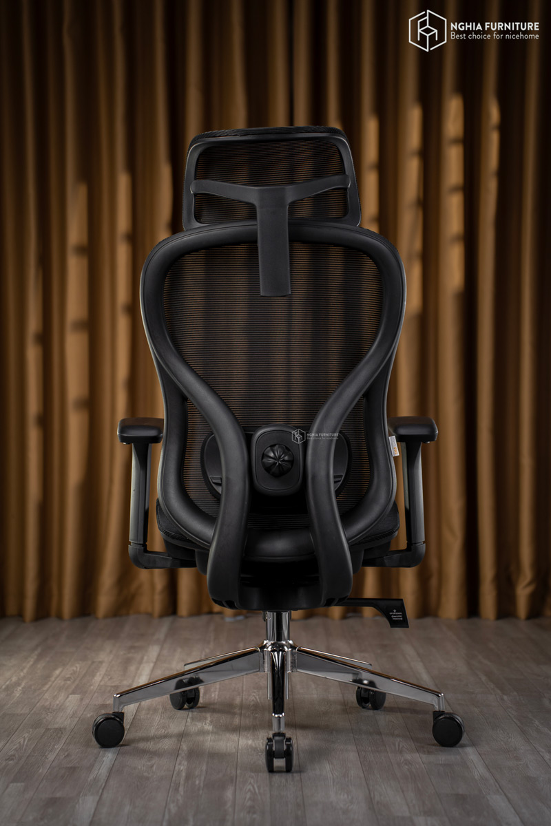 Phần lưng ghế được thiết kế liền khối, ôm trọn theo đường cong cột sống, giúp giảm áp lực cho vùng lưng dưới khi ngồi lâu. Điểm cộng lớn là nút chỉnh độ sâu lưng, cho phép người dùng tùy biến khoảng cách tựa sao cho vừa vặn với dáng ngồi và thói quen làm việc của mình – điều mà ít mẫu ghế trong tầm giá có được.