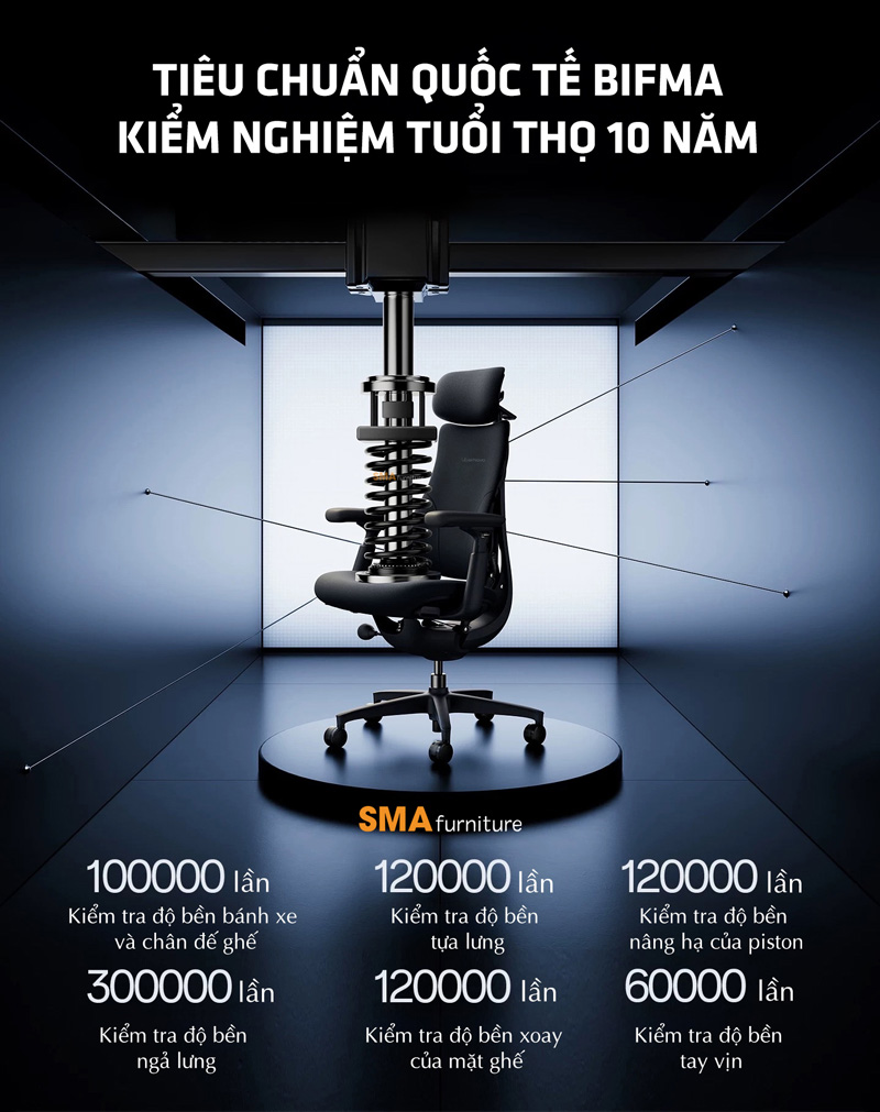 Toàn bộ hệ thống khung và bánh xe đều đạt tiêu chuẩn BIFMA X5.1 – một trong những chứng nhận quan trọng nhất đối với ghế công thái học, đảm bảo sản phẩm đáp ứng các yêu cầu khắt khe về độ bền, khả năng chịu lực và an toàn trong quá trình sử dụng lâu dài. Nhờ đó, người dùng có thể hoàn toàn yên tâm về độ ổn định cũng như tuổi thọ của sản phẩm trong môi trường làm việc hàng ngày.