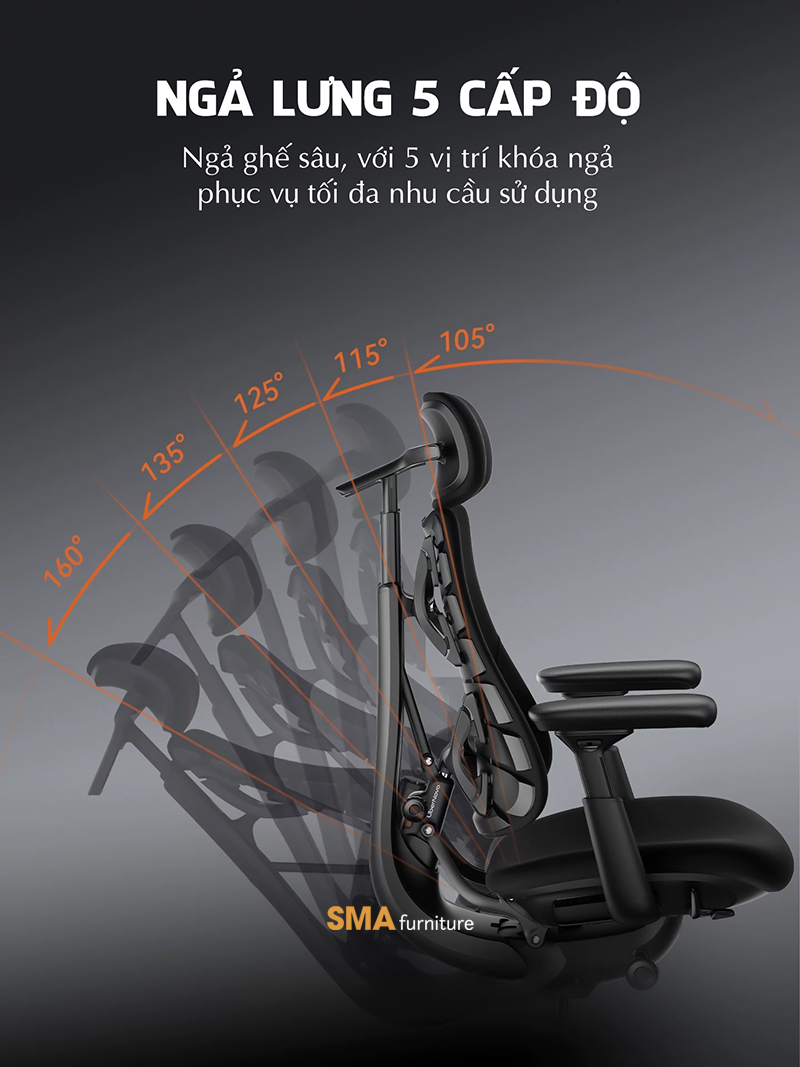 4. Hệ thống ngả lưng 105°- 160° kết hợp chuyển động đồng bộ toàn diện