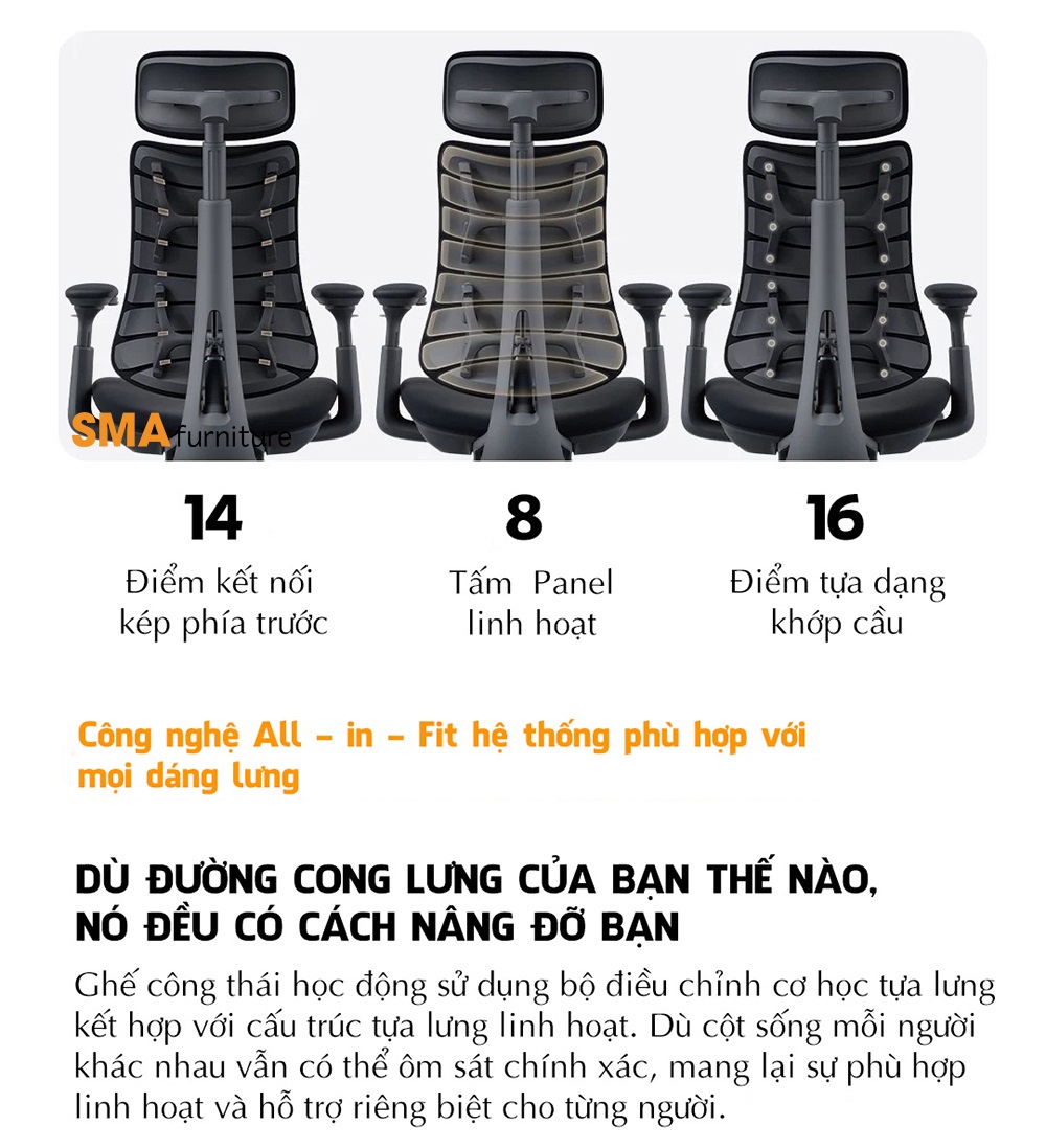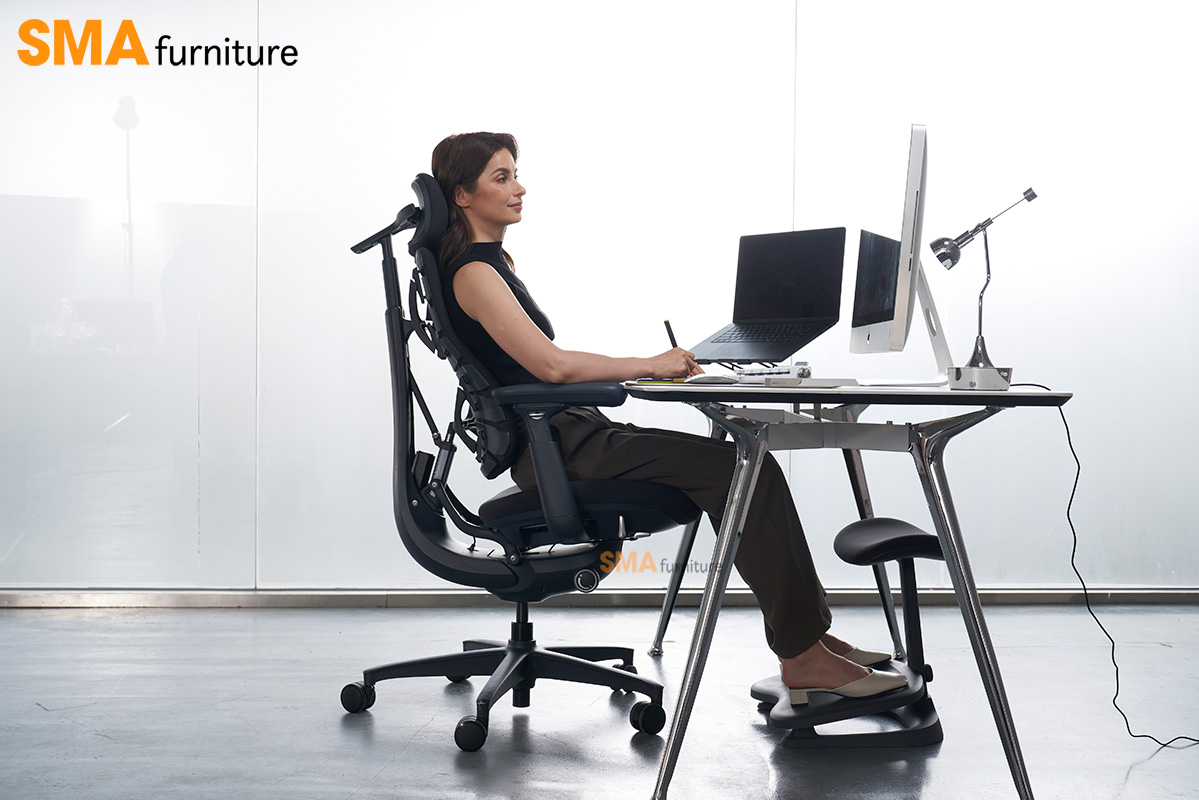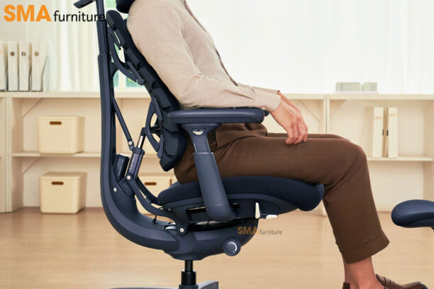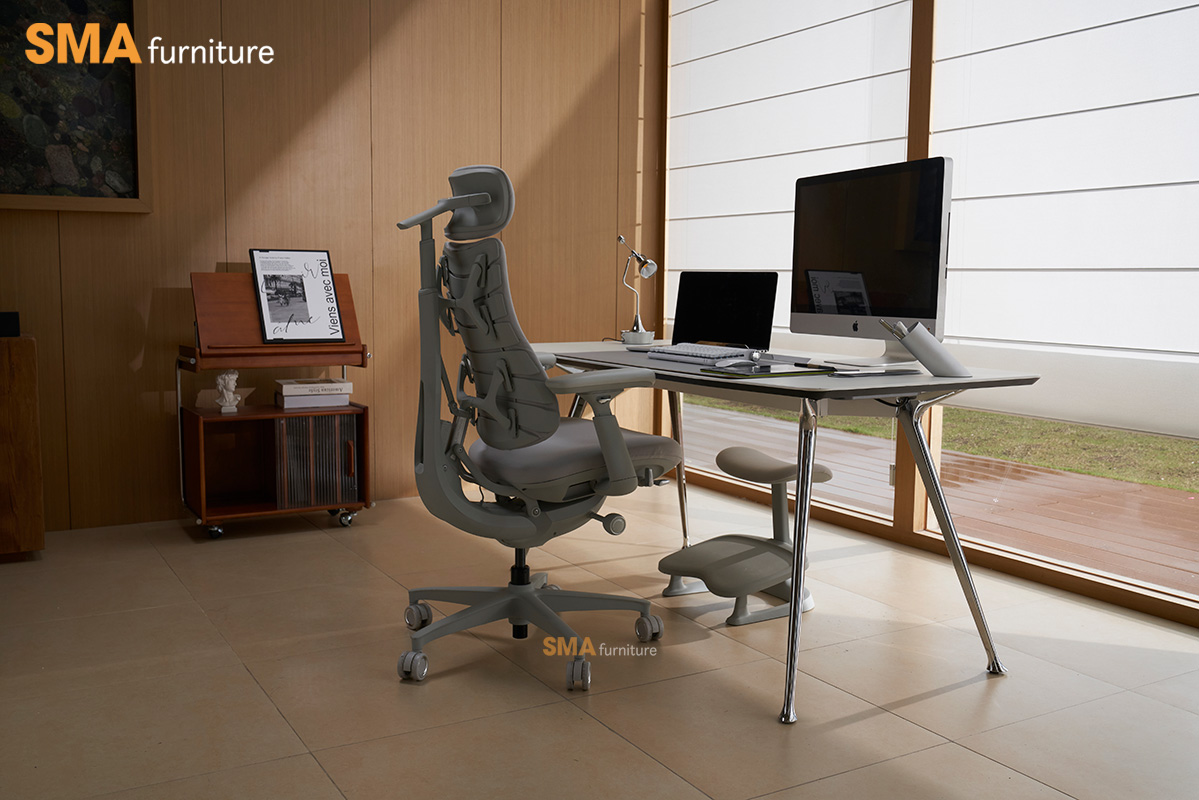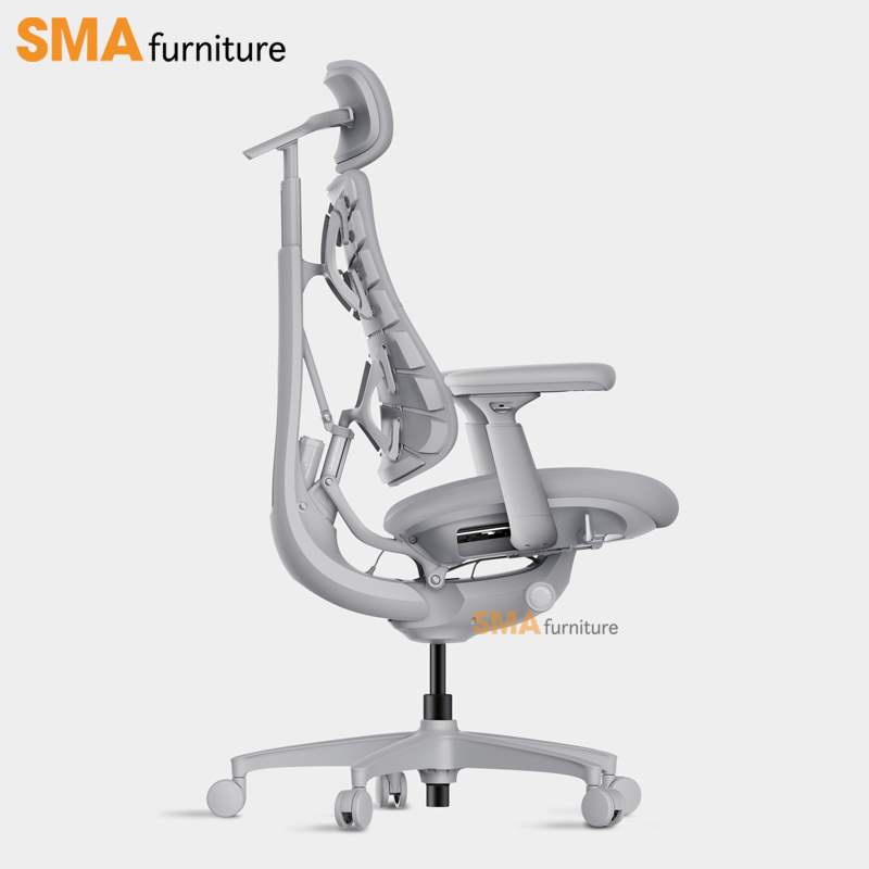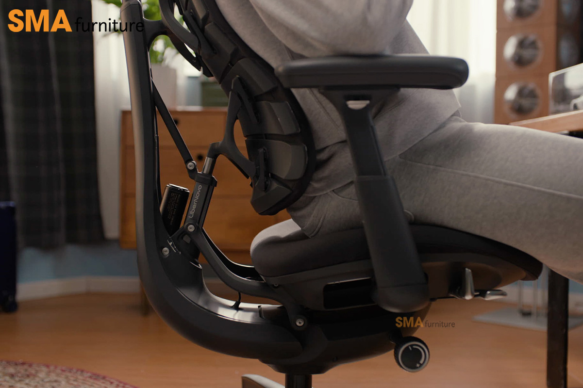 Điểm nổi bật nằm ở cơ chế đồng bộ toàn thân: từ tựa lưng, tựa đầu, tay vịn đến đệm ngồi đều di chuyển liền mạch theo góc ngả, đảm bảo cơ thể luôn được nâng đỡ ổn định trong mọi tư thế. Tựa đầu và lưng giữ sự căn chỉnh liên tục với tầm nhìn, trong khi tay vịn có thể trượt linh hoạt để hỗ trợ cánh tay ở nhiều vị trí khác nhau. Tất cả tạo nên một trải nghiệm liền mạch, giúp bạn duy trì sự thoải mái và hiệu suất dù đang làm việc, sáng tạo hay nghỉ ngơi.