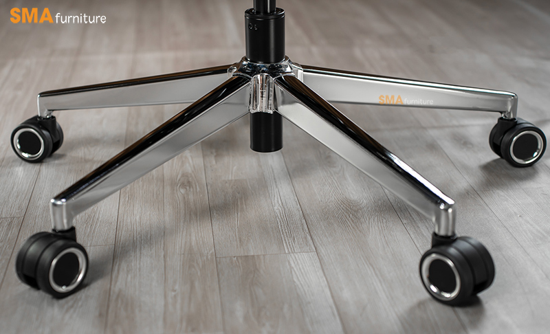 Chân ghế được làm từ inox đường kính 350mm, rất chắc chắn. Bánh xe PU đường kính 60mm xoay 360 độ linh hoạt, không gây trầy xước sàn, chống ồn và vận hành êm ái.