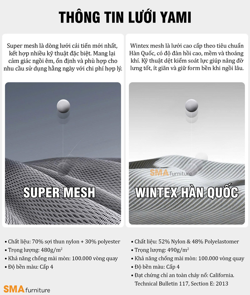 Ghế công thái học SMA Yami sử dụng lưới Wintex cao cấp từ Hàn Quốc và lưới Super Mesh V2 nội địa Trung – 2 loại lưới êm ái và bền bỉ trên thị trường hiện nay