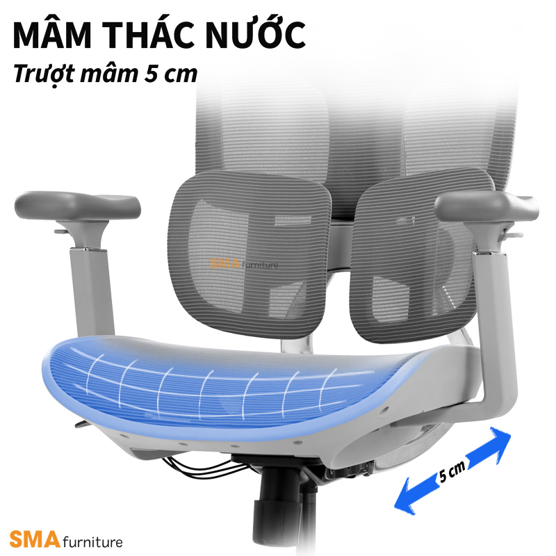 Với kích thước rộng rãi 51x51cm, phần nệm ghế được thiết kế theo dạng thác nước bo cong mềm mại, giúp phân tán áp lực lên mặt đùi và giảm tình trạng tê chân khi ngồi lâu. Ngoài ra, phần mâm ghế có thể trượt ra – vào tới 5cm, hỗ trợ điều chỉnh độ sâu phù hợp với chiều dài chân từng người.